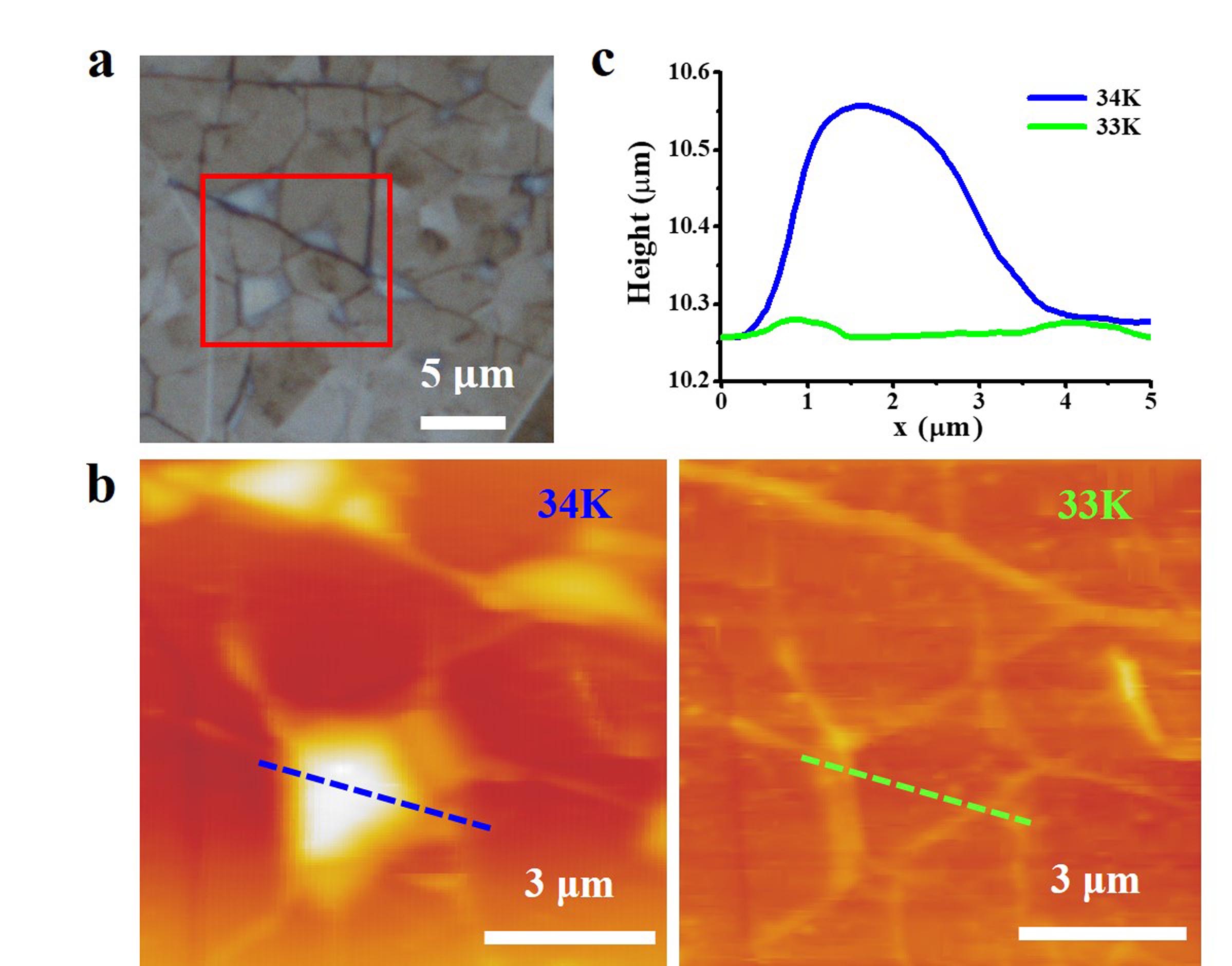 圖2. a: 六方氮化硼光學(xué)顯微鏡照片;b: 六方氮化硼34K與33K溫度下的低溫原子力顯微鏡形貌圖,當(dāng)溫度34K時(shí)存在氣泡(圖中亮色部分);c: 六方氮化硼氣泡不同溫度下的高度,當(dāng)溫度33K時(shí)氣泡消失