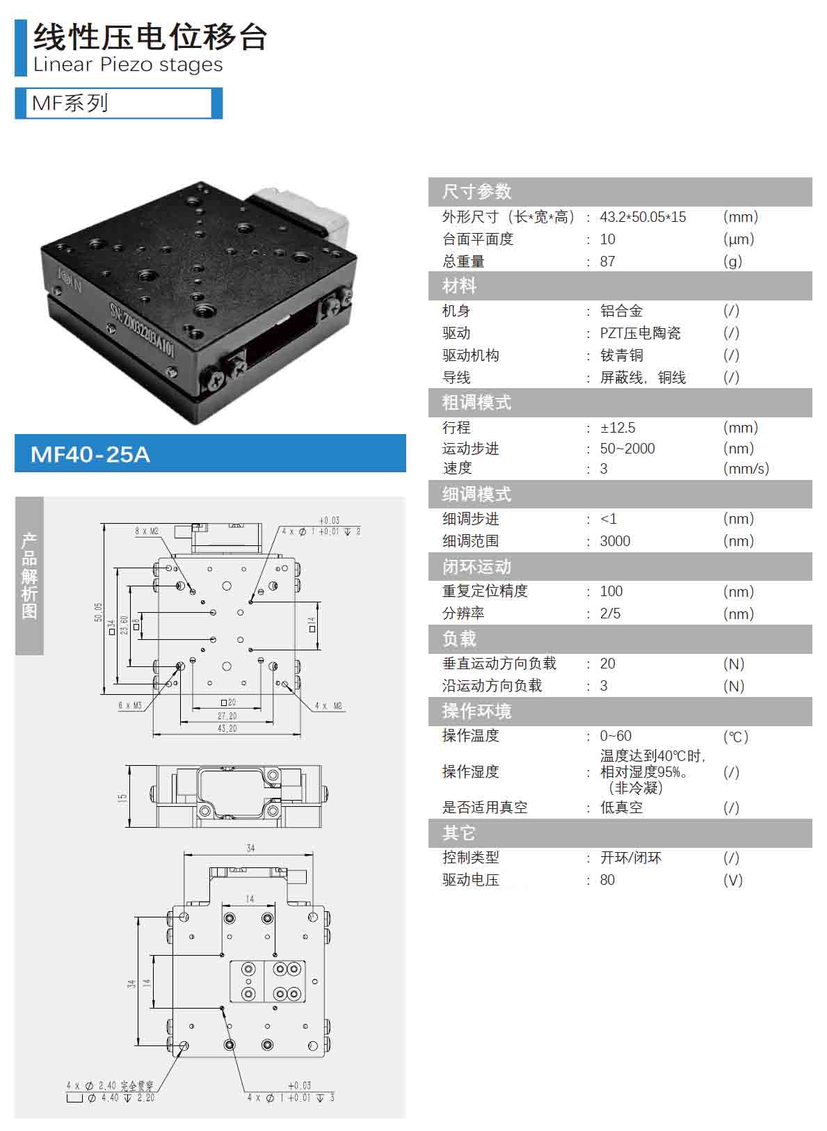 線性壓電位移臺(tái)-MF系列 MF40-25A技術(shù)參數(shù)